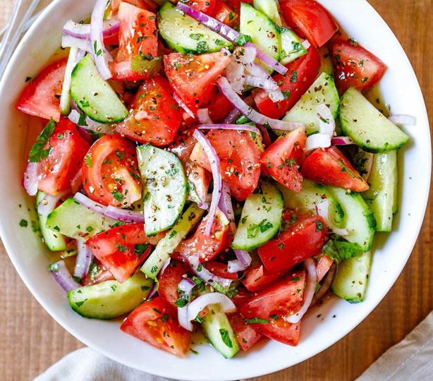 φρέσκια μοτσαρέλα, ντομάτα, αγγούρι, μαρούλι, κρεμμύδι