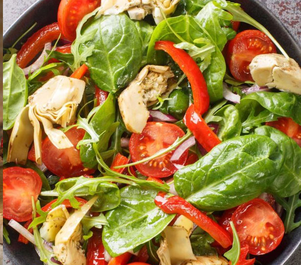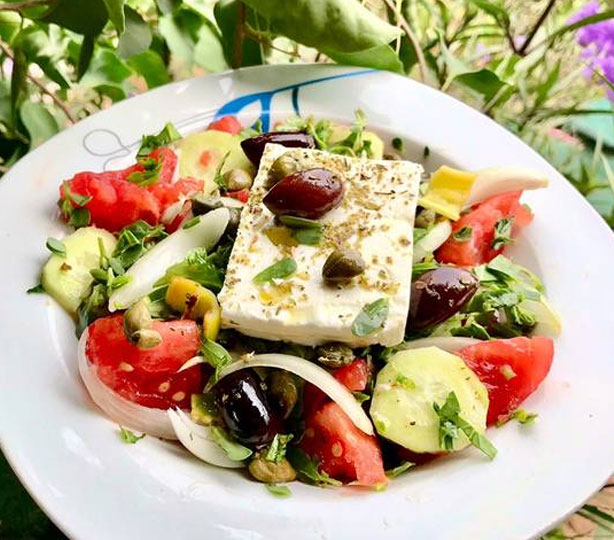 ντομάτα, αγγούρι, πιπεριά, ελιές, κρεμμύδι, κάπαρη & φέτα. Συνοδεύεται από μισό ψωμί φοκάτσια
